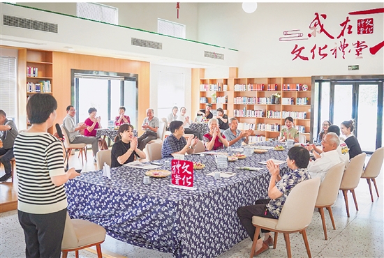 | ◀ 日前,在海盐县沈荡镇永庆村文化礼堂“六点半茶铺”——“同心茶馆”,“盐讲·青年说”宣讲团成员结合身边事与大家交流习近平总书记考察浙江重要讲话精神,近30名村民和新居民认真聆听。 见习记者 许钟予 拍友 朱沈懿 摄 |