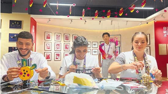 9月29日是中秋佳节,杭州亚运村里举行丰富多彩的庆祝活动。图为巴勒斯坦运动员在运动员村文化屋内体验我省非遗项目“深澳灯彩”。