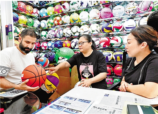 外国客商来义乌采购体育用品。 共享联盟·义乌 吴峰宇 摄