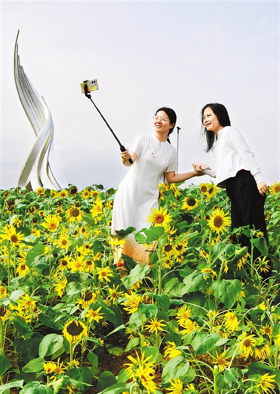 国庆假期,在金华市金东区新鸿广场区块,近150万株法兰西向日葵竞相开放,吸引游客和摄影爱好者前来拍照打卡。