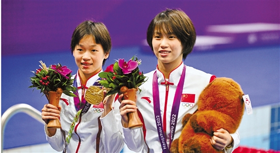 10月3日,全红婵(左)和陈芋汐在杭州亚运会女子10米跳台颁奖仪式上。