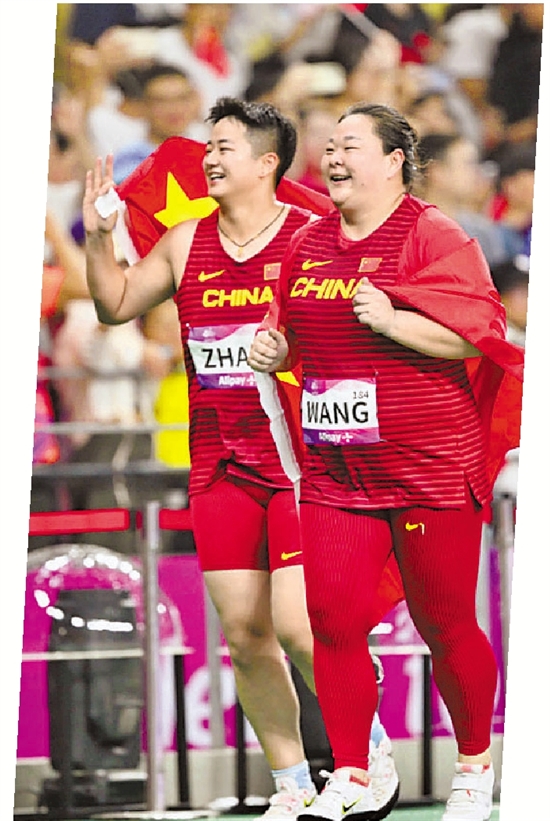 9月29日晚,王峥(右)、赵杰包揽女子链球冠亚军。