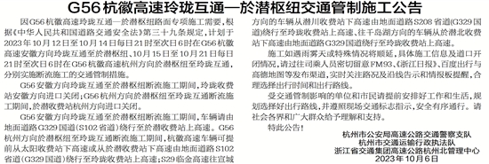 因G56杭徽高速玲珑互通—於潜枢纽路面专项施工需要,根据《中华人民共和国道路交通安全法》第三十九条规定,计划于2023年10月12日至10月14日每日21时至次日6时在G56杭徽高速安徽方向玲珑互通至於潜枢纽、10月15日至10月21日每日21时至次日6时在G56杭徽高速杭州方向於潜枢纽至玲珑互通,分别实施断流施工的交通管制措施。