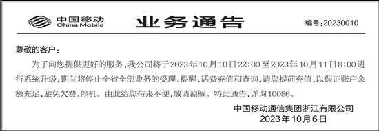为了向您提供更好的服务,我公司将于2023年10月10日22∶00至2023年10月11日8∶00进行系统升级,期间将停止全省全部业务的受理、提醒、话费充值和查询,请您提前充值,以保证账户余额充足,避免欠费、停机。由此给您带来不便,敬请谅解。特此通告,详询10086。