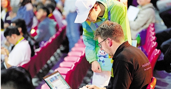 10月8日,闭幕式上,“小青荷”在服务外国记者。 本报记者 彭鹏 摄