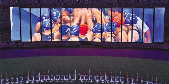 10月8日,闭幕式上播放的短片展现了赛场内外的真挚情谊。 本报记者 倪雁强 摄