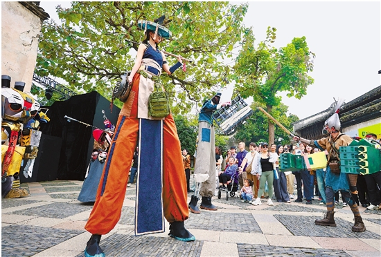 乌镇戏剧节嘉年华巡游现场,游客驻足观看。