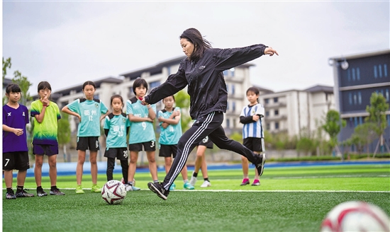 做射门示范时,董云云要求小球员将注意力放在每一个技术动作上。