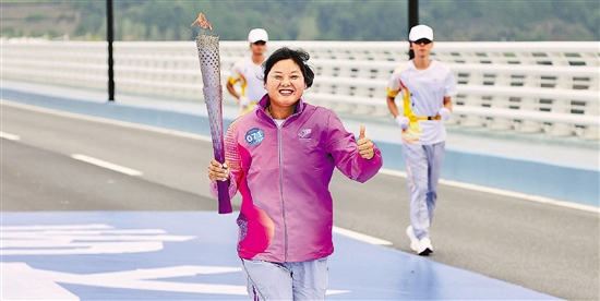 姚娟在淳安传递火炬。 本报记者 吕之遥 徐彦 摄