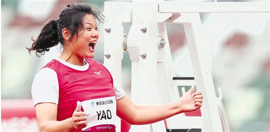 姚娟在东京残奥会女子铁饼F64级决赛中庆祝夺冠。
