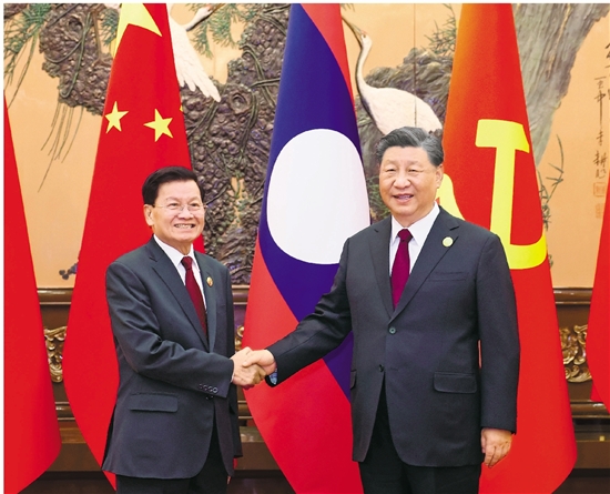 10月20日上午,中共中央总书记、国家主席习近平在北京人民大会堂会见来华出席第三届“一带一路”国际合作高峰论坛并进行工作访问的老挝人民革命党中央总书记、国家主席通伦。 新华社记者 刘卫兵 摄