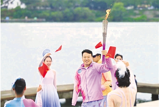 桐庐站第一棒火炬手宋懋璗接过火炬。 本报记者 徐彦 摄