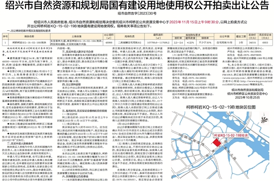 经绍兴市人民政府批准,绍兴市自然资源和规划局决定委托绍兴市柯桥区公共资源交易中心于2023年11月15日上午9时30分,以网上拍卖方式公开出让柯桥柯岩KQ-15-02-19B地块国有建设用地使用权。现将有关事项公告如下: