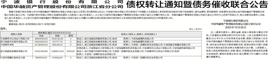 根据宁波银行股份有限公司与中国华融资产管理股份有限公司浙江省分公司签订的《债权转让协议》,宁波银行股份有限公司已将其对下列借款人及其担保人享有的权利(包括但不限于担保债权、违约金债权、损失赔偿权、利息债权)依法转让给中国华融资产管理股份有限公司浙江省分公司。宁波银行股份有限公司特公告通知各债务人及担保人(或义务承担人),从公告之日起向中国华融资产管理股份有限公司浙江省分公司履行相关义务。中国华融资产管理股份有限公司浙江省分公司作为上述资产的受让方,现公告要求各债务人及担保人或义务承担人,从公告之日起向中国华融资产管理股份有限公司浙江省分公司履行主债权合同及担保合同约定的偿付义务或相应的担保责任或法院判决文书所确定的义务。