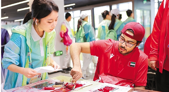 亚残运村志愿服务中心,“小青荷”帮助运动员体验中国文化。 拍友 俞晓涵 摄