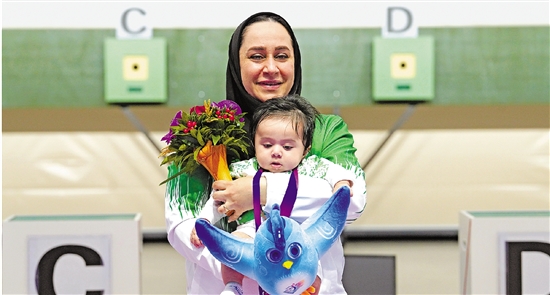 萨雷赫·贾万马尔迪抱着3个月大的宝宝领奖。 本报记者 马赛洁 摄