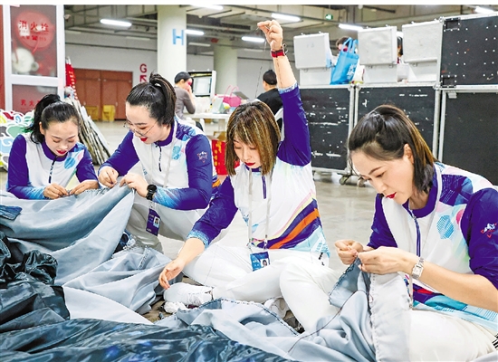 演出所需要的幕布经过多次排练后出现缝隙,老师们仔细缝补。