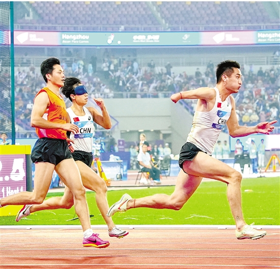 10月27日下午,杭州亚残运会4X100米混合接力项目开赛,观众一次性可看到四个不同级别的男女运动员在场上接力“奔跑”。参赛的中国队运动员有通过引导员领跑的,有独自站立奔跑的,也有坐轮椅竞速的。最终,中国队以46秒15顺利晋级决赛,这一成绩也创造了新的赛会纪录。 本报记者 董旭明 杨晓轩 摄 |