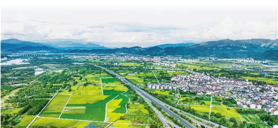 台金高速公路穿越仙居县白塔镇金色的田野和美丽乡村(无人机照片)。 拍友 陈月明 摄