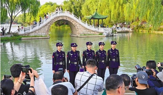 10月30日,杭州西湖女子巡逻队亮相扬州瘦西湖,续写文旅融合佳话。杭州和扬州同为运河沿线城市,两地在“京杭对话——千年运河千里行”活动期间,开展西湖女子巡逻队“遇见”瘦西湖交流活动,传播西湖的人文之美。 本报记者 董旭明 拍友 鲍圣慧 摄 |