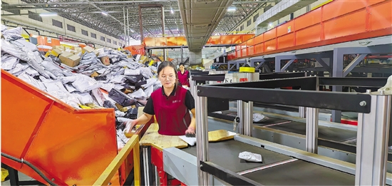 10月30日,圆通义乌江湾分公司的智能化分拣车间内,员工在一线忙碌,备战“双十一”。预计“双十一”期间,该网点日均快递业务量峰值将突破100万单,同比增长30%左右。