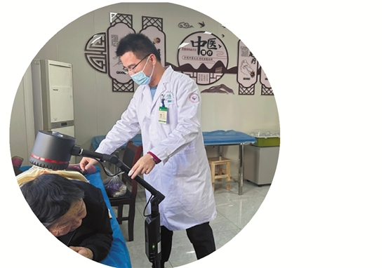 80岁的新桥村民胡根美在村卫生室中医理疗