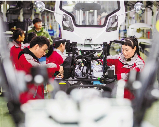 1月19日,位于湖州市长兴经济技术开发区的浙江睿璞智能汽车股份有限公司数字化车间里,工人在生产线上忙碌作业,赶制新能源微型物流车订单。 拍友 谭云俸 摄