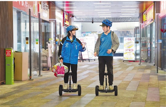 6月14日,黄晓琴(左)正在和徒弟陈亚非交流送外卖的技巧。 本报记者 马赛洁 摄