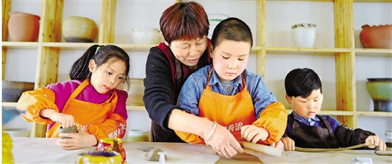 南浔区善琏镇窑里村窑文化馆内,孩子们体验陶艺制作。 陆志鹏 摄