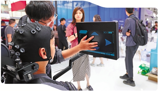 | 9月13日,2024年中国国际服务贸易交易会上,工作人员为参观者讲解韶脑科技的脑控神经康复训练机器人。该机器人使用非侵入式脑机接口技术,通过解析使用者脑电波并转换成操控信号,可以让使用者通过机器人进行自主移动。 新华社记者 戚晓毅 摄 |
