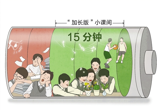 自新学期开始,北京、浙江、福建等多地将中小学课间从10分钟延长至15分钟。“加长版”小课间能让孩子动起来、跑起来,多见阳光。正如教育部相关负责人在新闻发布会上说的那样,课间时间延长,是一个意义重大的“小切口”,它延展了“五育”的形式和内容。如何用好“加长版”小课间,学校应整体统筹、优化安排,同时也要培养孩子规划课间、管理时间的能力。 林琳 潘泓璇 作 |