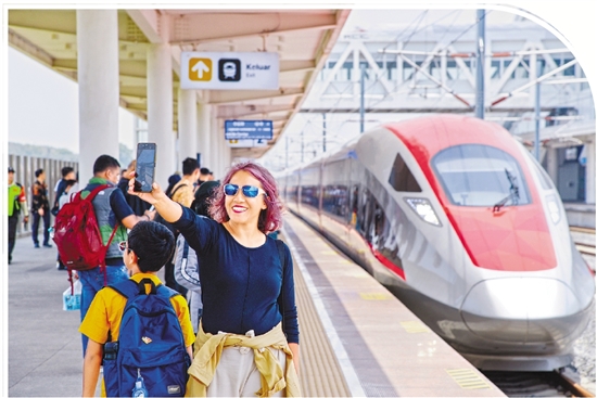 10月17日,在印度尼西亚帕达拉朗站,乘客在雅万高铁高速动车组前自拍。