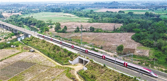 在印度尼西亚卡拉旺站附近,一列高速动车组行驶在雅万高铁上。