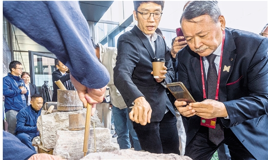11月26日,参加第二届“良渚论坛”“文明之光”中外考古学家对话平行论坛的专家了解良渚先民玉器加工技艺。 本报记者 徐彦 姚颖康 摄