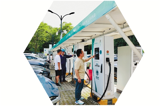 7月9日,萧山区观澜路钱江世纪公园充电站内,电动车主正在体验浙江首次充放换一体“车网互动”应用。 姚靖霖 摄