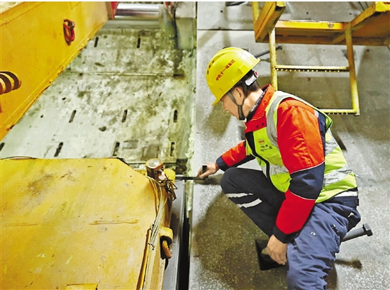 曹恒军在测量管片和管片吊机的间距。 通讯员 周俊 摄