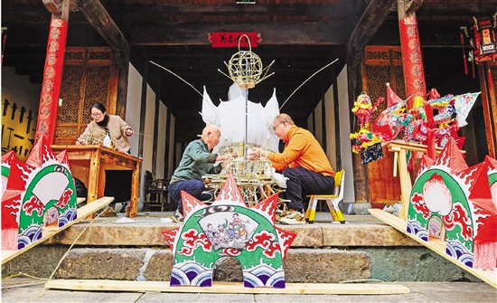 1月24日,在金华市浦江县非物质文化遗产保护馆里,师傅们正忙着赶制春节期间将赴北京展演的板凳龙。经过一个星期的扎制,目前板凳龙已完成骨架部分,进入糊裱技艺的制作阶段,争取除夕前完工。届时,浦江将组建百人团队,带着66桥子灯组成的板凳龙赴北京参加展演。 此次,浦江板凳龙受邀参加元宵节期间由文化和旅游部非遗司指导、中国非遗馆策划组织的“过年——春节主题展”系列活动。 本报记者 潘秋亚 拍友 时补法 摄 |