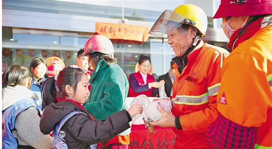 1月28日,暖“新”早餐计划活动现场,小志愿者为户外工作者发放早餐。 共享联盟·路桥 蔡亿杨 通讯员 陶钇成 摄
