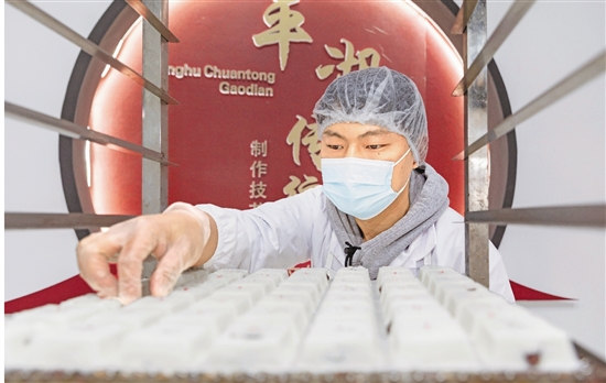 赵启涛查看尺糕的软硬程度。 共享联盟·平湖 王强 摄