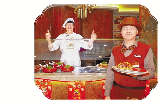 义乌贝迪餐厅内,厨师和服务员展示菜品。 本报记者 叶振宇 摄