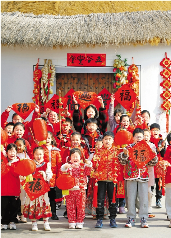 杭州市临平区塘栖镇丁山河村“塘栖百匠”省级非遗工坊——“幸福的院子”内,小朋友身着鲜艳服饰,提灯笼、拿福字,欢度春节。 本报记者 胡元勇 魏志阳 摄