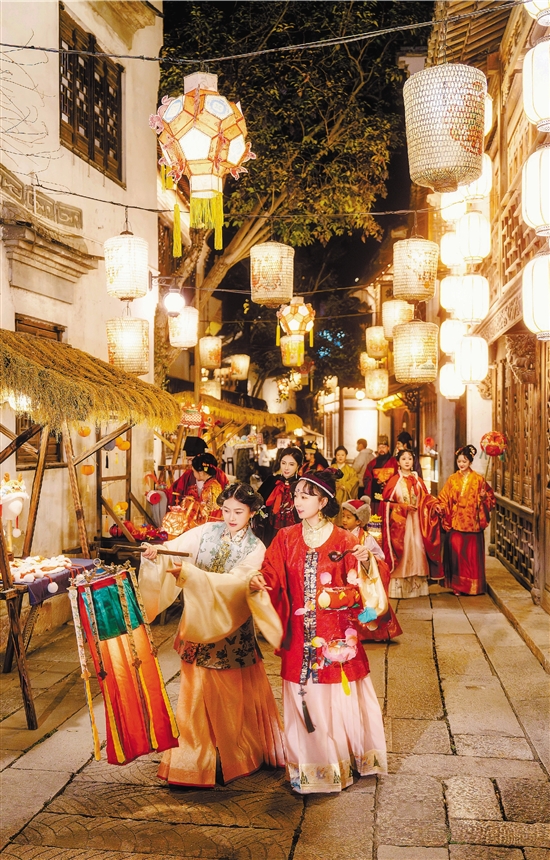 嘉兴桐乡濮院古镇千灯齐放,身着国风汉服的游客提灯走巷,沉浸式体验古韵花灯间的中式美学。 本报记者 倪雁强 王志杰 拍友 沈清辉 摄