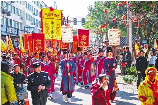 太公祭巡游吸引了游客驻足围观。 雷思涵 摄