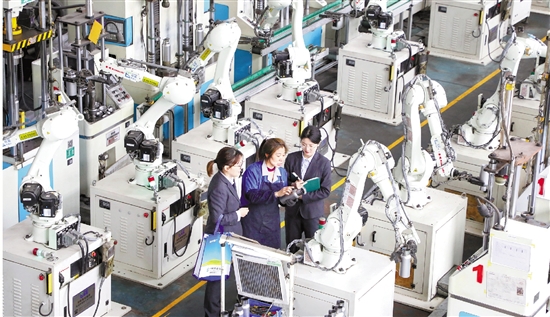 农行金华分行客户经理走访企业,了解全智能生产线。农行金华分行供图