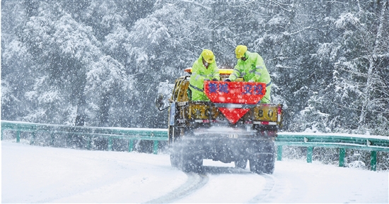 2月20日,金华市双龙风景区大雪纷飞,部分路段积雪厚度达10厘米左右。为确保道路安全畅通,婺城交投鑫畅公司竹马公路管理站迅速组织应急抢险队,携带扫雪机、工业盐、铁锹等设备物资赶赴现场顶风冒雪全力清除积雪。 本报记者 潘秋亚 共享联盟·金华 时宽兵 摄 |