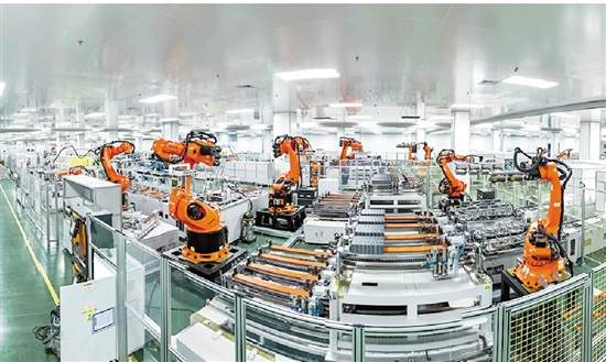 凌骁能源科技(武义)有限公司智能化生产车间内,一条条机械臂正有序地将电池组成电池包。