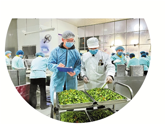 记者(前排左)在天天向上餐饮公司测量、记录菜品温度。