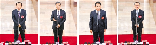 3月5日,第十四届全国人民代表大会第三次会议首场“部长通道”集中采访活动在北京人民大会堂举行。从左至右依次是交通运输部部长刘伟、教育部部长怀进鹏、国家市场监督管理总局局长罗文、国家金融监督管理总局局长李云泽接受媒体采访。
