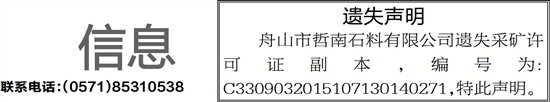 舟山市哲南石料有限公司遗失采矿许可证副本,编号为:C3309032015107130140271,特此声明。
