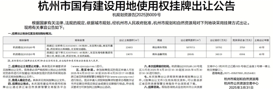五、竞买申请。参加挂牌竞买的竞买申请人可在2025年4月20日16∶30至2025年4月29日17∶00登录浙江省自然资源智慧交易服务平台(www.zjzrzyjy.com)进行报名。竞买申请人须按照挂牌须知要求办理数字证书并足额交纳竞买保证金或提交足额银行保函,符合竞买要求方可参加网上挂牌出让活动。